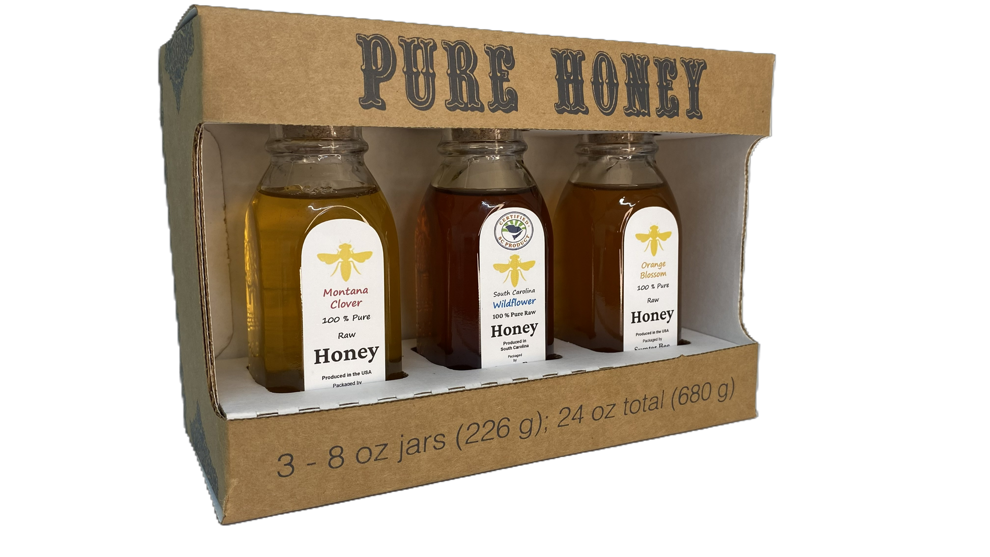 Available honey varieties: Blueberry, Orange Blossom, Montana Clover, SC Wildflower, Georgia Wildflower
