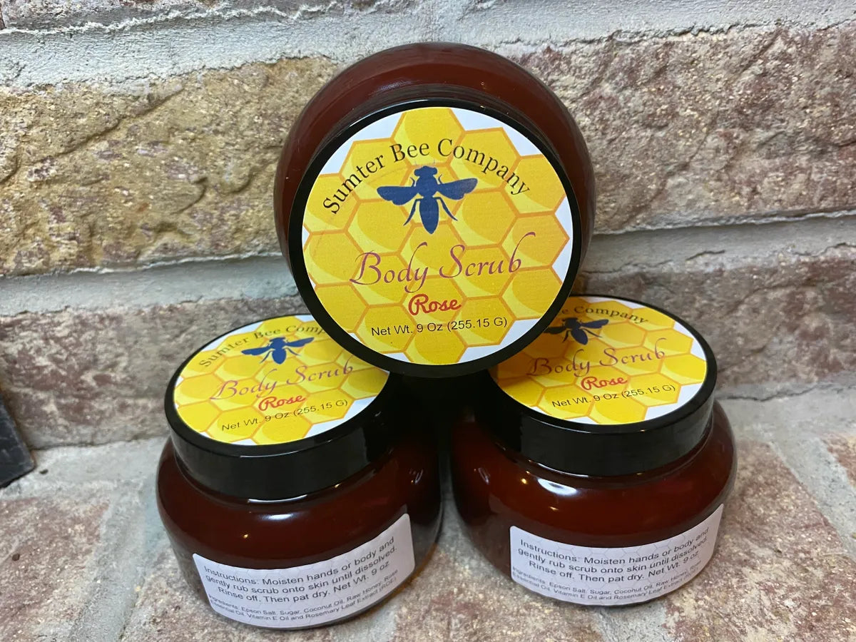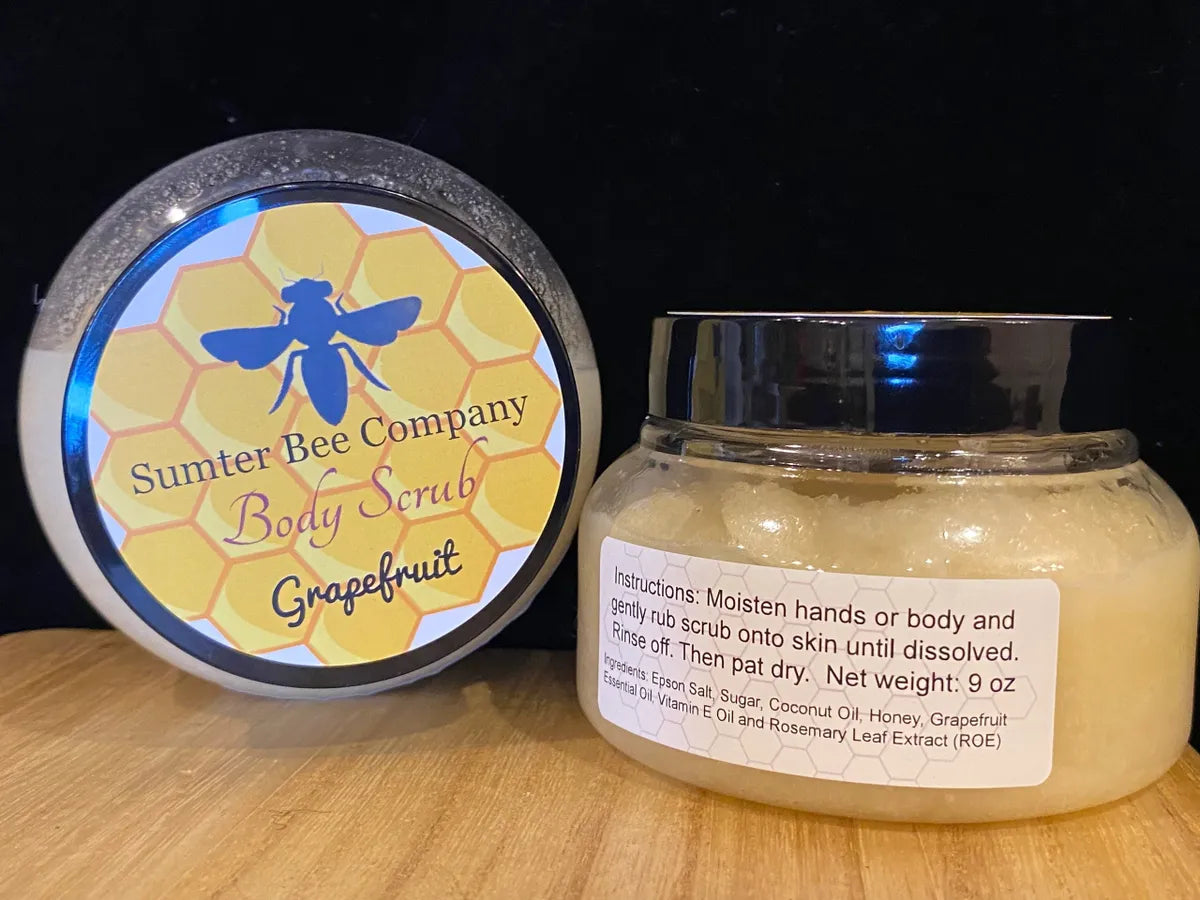 Body Scrub Indulge in the luxurious exfoliation of our Body Scrub, made with all-natural ingredients including tea tree oil and honey from Sumter Bee Company. Perfect for smooth, glowing skin. Instructions: Moisten hands or body and gently rub scrub onto skin until dissolved. Rinse off. Then pat dry. Ingredients: Epson Salt, Sugar, Coconut Oil, Sumter Bee Company Honey, Grapefruit Essential Oil, Rose or Tea Tree Essential Oil, Vitamin E Oil and Rosemary Leaf Extract (ROE)