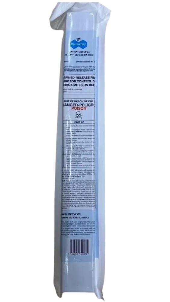 With the VarroxSan strips, oxalic acid is released slowly, providing a method of mite treating that is effective and natural! Safe to use during honey flow, it is the most effective when outside temperatures are above 60 degrees and the bees are very active within the hive.Four strips are used per 10 brood frames. Treatments can last 42 to 56 days. Shelf life is 24 months. This is a 20 Strip pack.